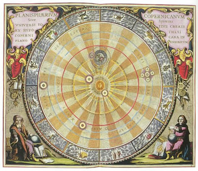 Representação dos sete planetas em torno do Sol de acordo com a visão de Nicolau Copérnico. A imagem integra a obra Harmonia macrocósmica, de Andreas Cellarius, publicada em Amsterdã, 1960.